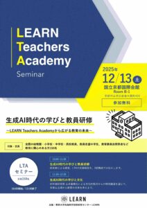 ※※ ATACカンファレンスに先立ち、12月13日(土)午前中に、同会場にて、LTA(東京大学先端科学技術研究センターLEARN)が主催するセミナー「生成AI時代の学びと教員研修 ~LEARN Teachers Academyから広がる教育の未来 ~」が実施されます。こちらの参加費は無料ですが参加登録が必要です。詳細及びにお申し込み方法は、LTA(LEARN Teachers Academy)公開セミナー のホームページ よりご確認ください。